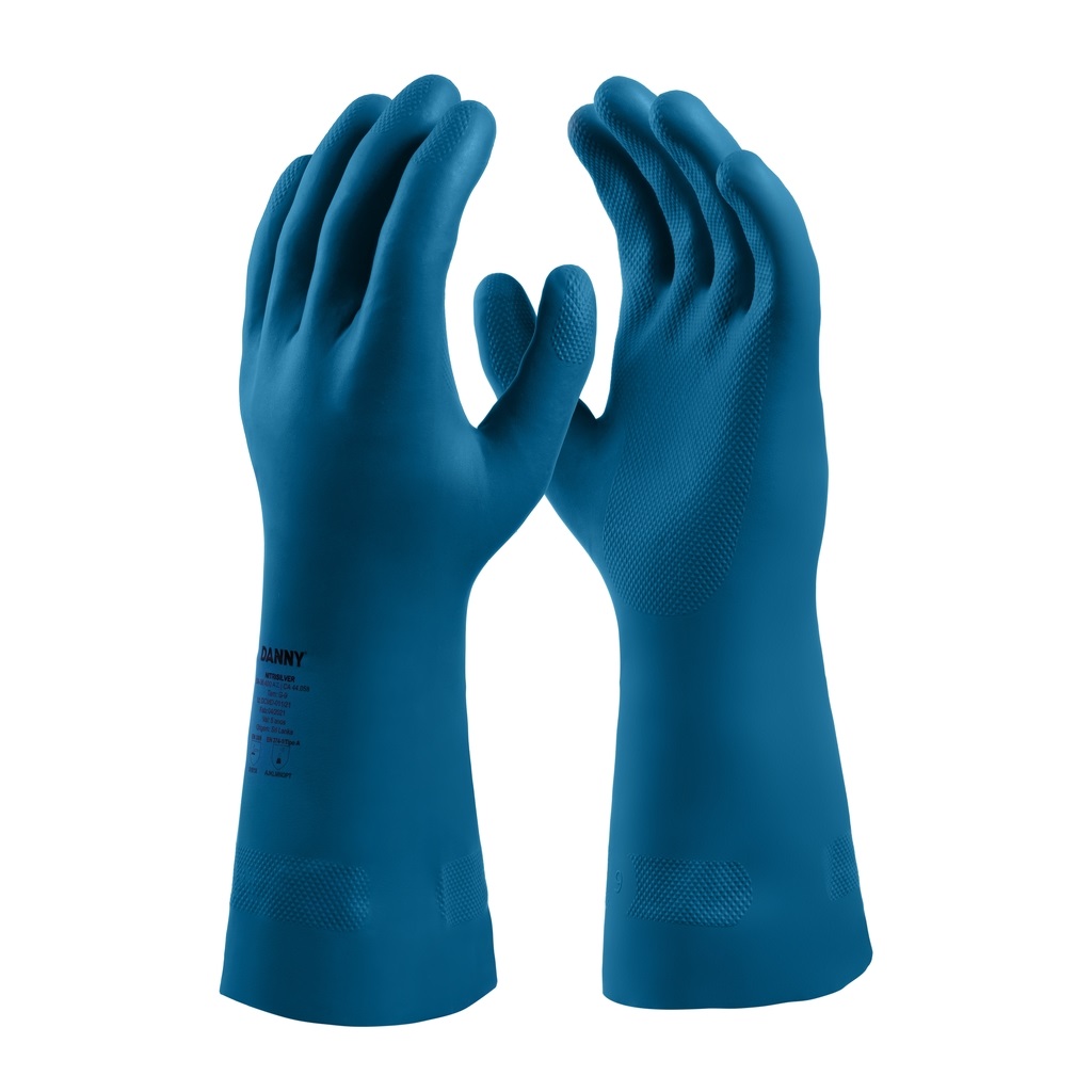 Luva de segurança, confeccionada em borracha nitrílica, interior em verniz silver, antiderrapante na palma, face palmar dos dedos e ponta dos dedos e possui punho reto.